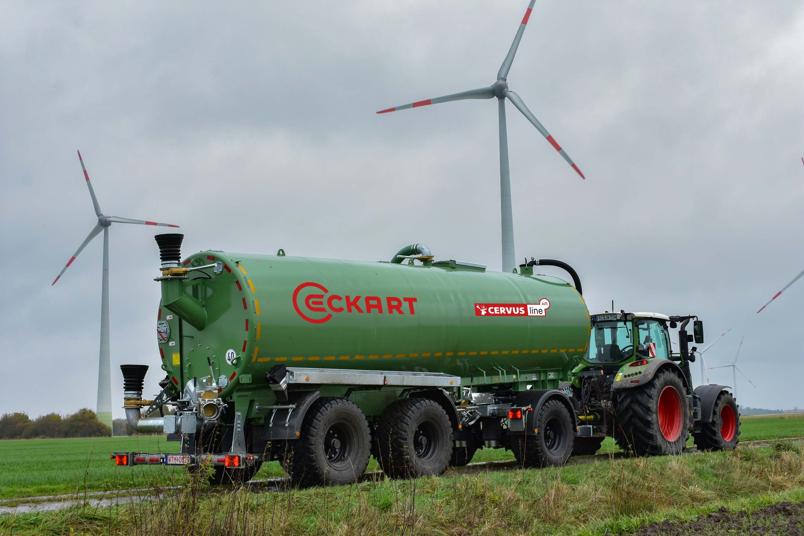Für das absätzige Verfahren führen straßenspezifisch konzipierte Fässer Gülle von den Güllelagern zum auf dem Feld aufgestellten Profi-Ausbringfass. Diese Transportfässer zeichnen sich durch hohes Transportvolumen sowie straßenspezifisch ausgelegte Bereifungen und Fahrwerke aus und laufen bei uns unter dem Begriff „Tankwagen“. Schnellläuferachsen geben diesen Transportgiganten ein im LKW-Bereich gefordertes Straßenverhalten.