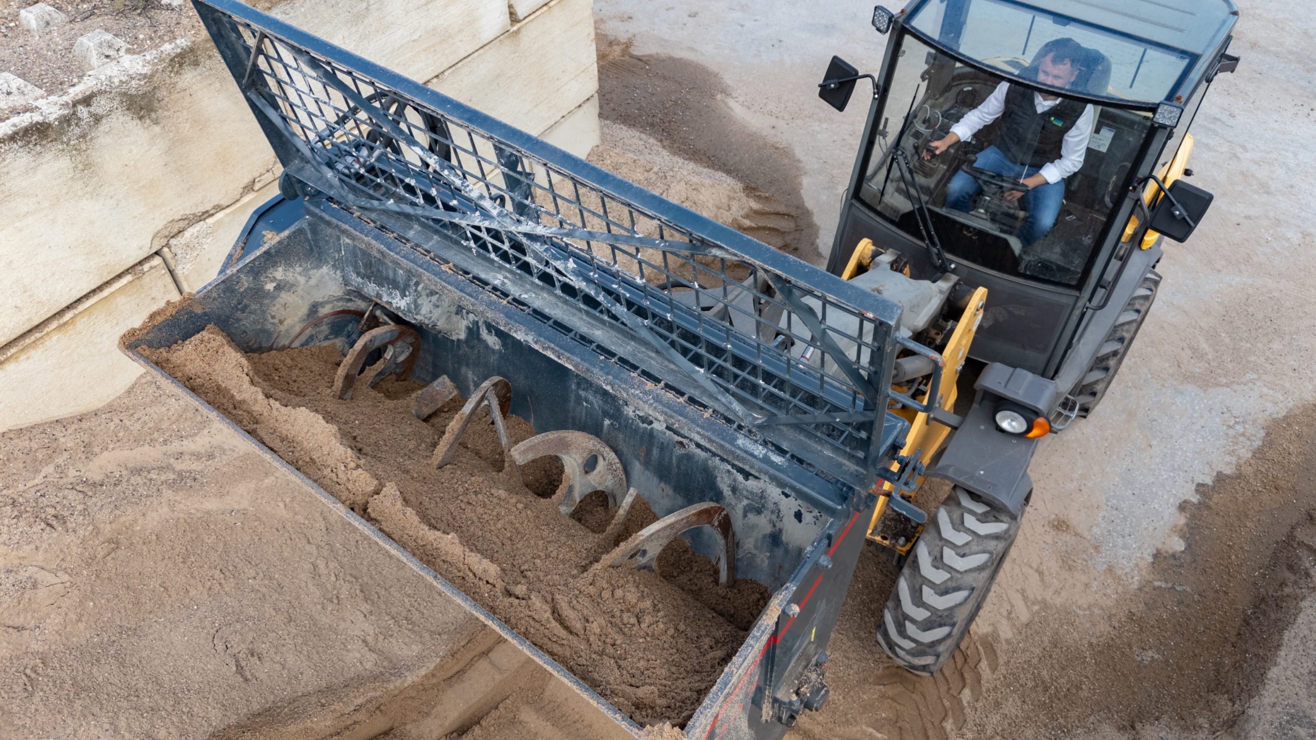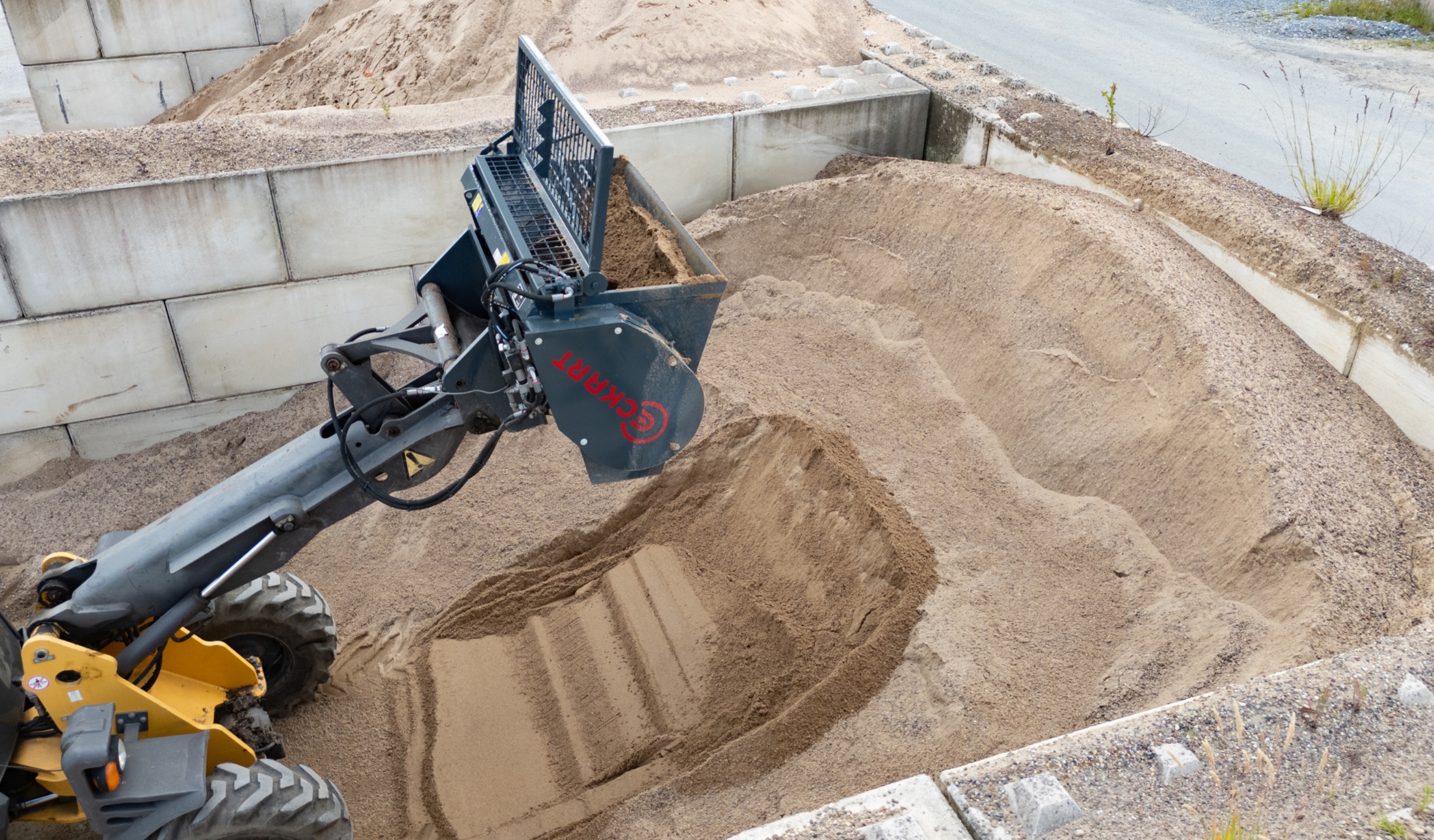 Die Multi-Mischschaufel kann nach vorne über die Schneidkante oder dosiert über die hydraulische Bodenöffnung entleert werden. Für die hydraulische Bodenöffnung ist kein weiterer Steuerkreis am Trägerfahrzeug erforderlich.